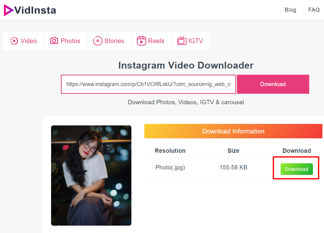 Step 2: Open a web browser and go to Vidinsta.io and paste your link into the tool and click Download